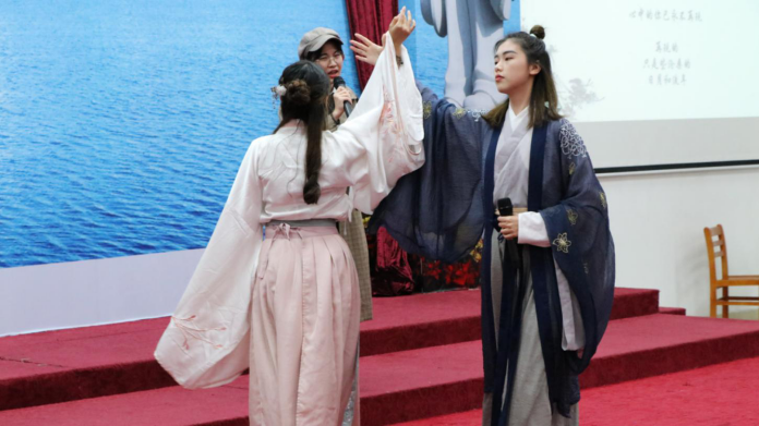 the red chapter队带来的作品《前缘》、《离思五首》、《悲歌》则给现场观众带来是不一样的视觉,以朗诵配上优美的舞姿、传统的汉服把经典作品演绎得更加唯美。