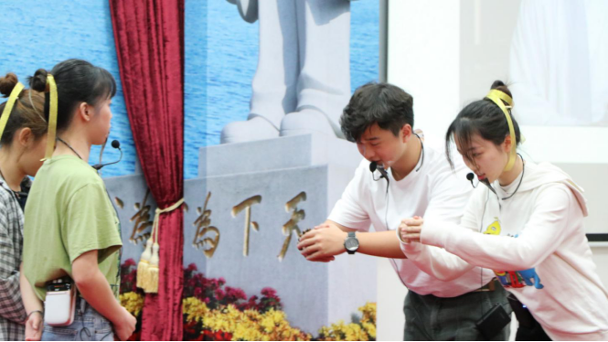 玉茗队以两人对话的的方式 把梁启超先生的散文《少年中国说》以不同形式的的方式把《少年中国说》以吟诵方式展现另一种韵味,传承经典。