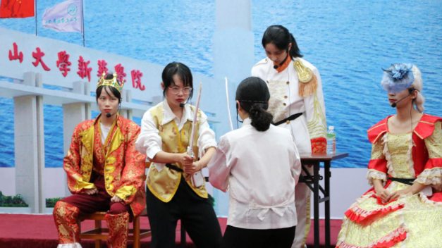 广州校区代表队的作品《哈姆雷特》则是展示了作品中的一个场景,分享者们都身着华丽的服装,一瞬间把观众带回到作品主人公生活的时代,让在场的观众仿佛间穿越回到了莎士比亚笔下的生活世界。