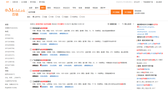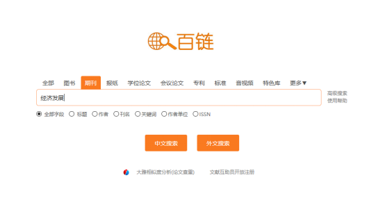 “查”——“一站式”检索为读者检索全球所有的学术资源,查找范围广泛,百链目前拥有7.2亿条元数据,支持从外文图书、期刊、学位论文、会议论文、专利、标准等各类元数据中找出您想要的信息。