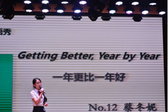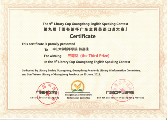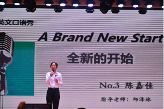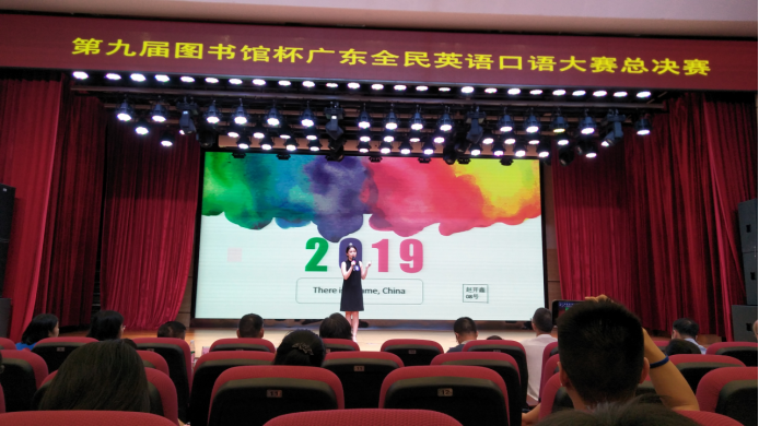 在广东赛区总决赛现场,来自全省不同图书馆的17位读者,在决赛现场都展示出了自己的精彩口语能力。第一部分为英语口秀语,读者自拟题目进行3分钟演讲。我校读者陈嘉佳演讲的题目是《全新的开始》、赵开鑫演讲《有一个名字叫中国》、蔡冬妮演讲《一年更比一年好》。
