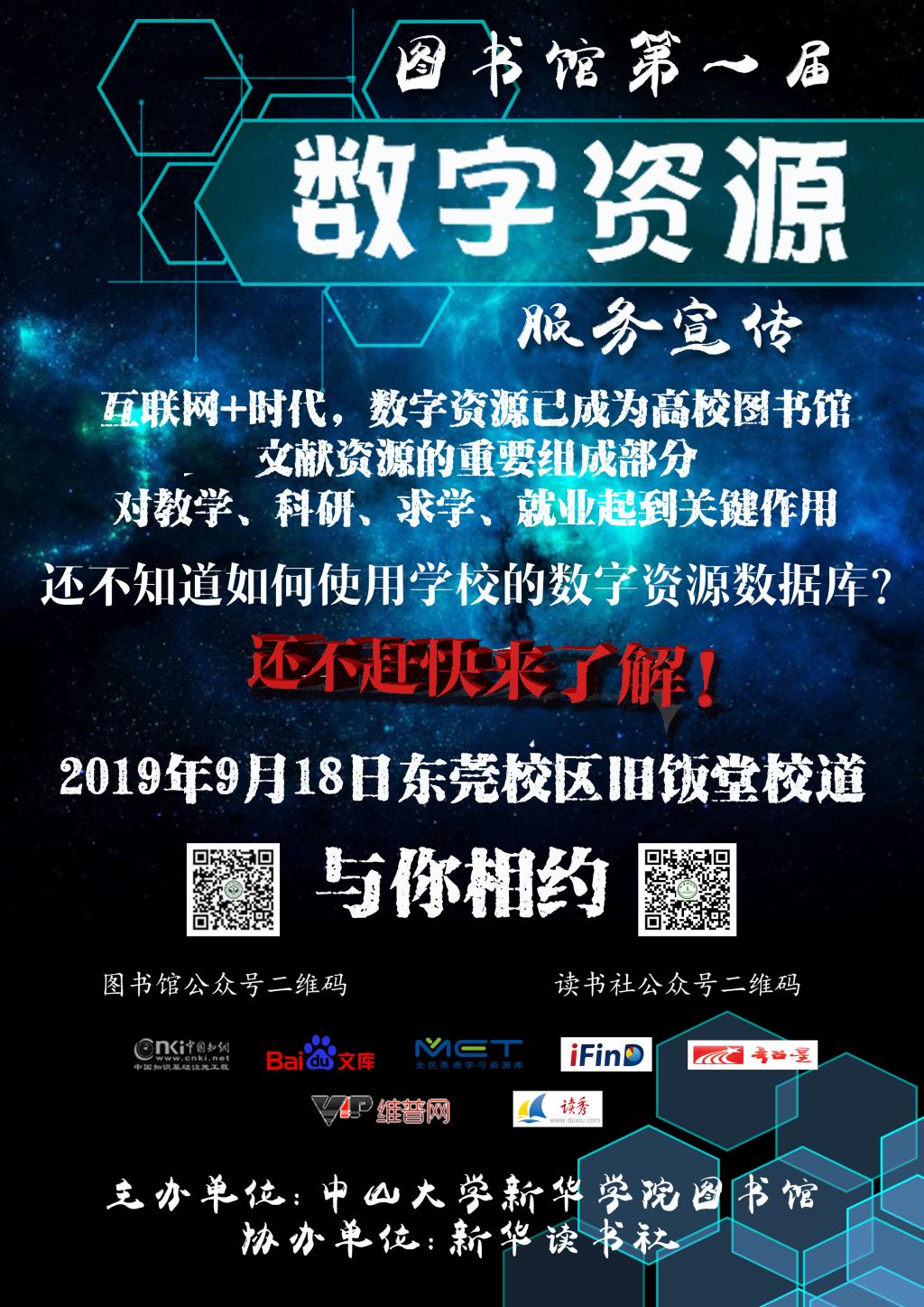 为了为更好地向我校师生宣传推广图书馆的资源,让广大读者了解并掌握图书馆已购买或试用的各种数字资源数据库的使用方法和技巧,更好地提高图书馆数字资源的利用率,让图书馆的资源能够更好地服务于我校老师的教学科研和学生的学习。图书馆将于2019年9月18日在东莞校区旧饭堂校道举办“数字资源”进校园服务宣传活动。