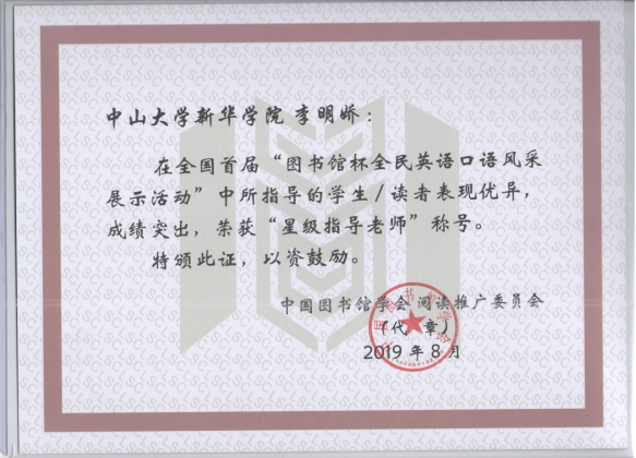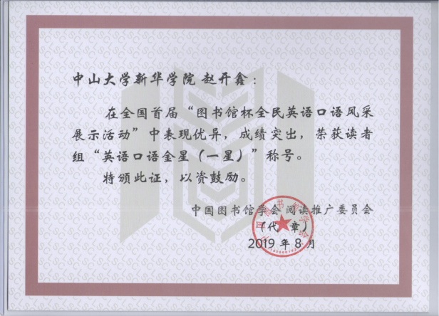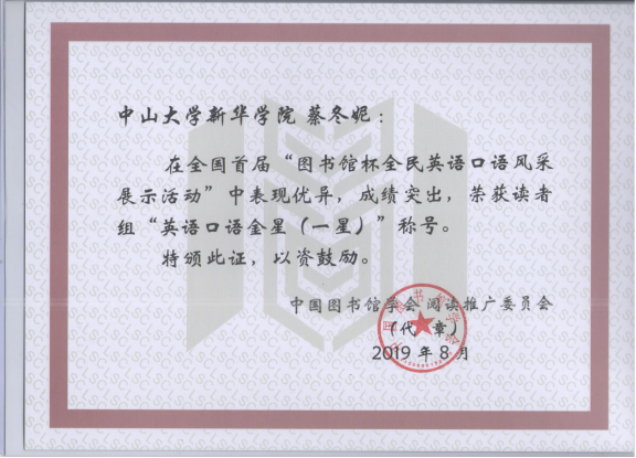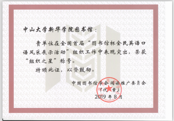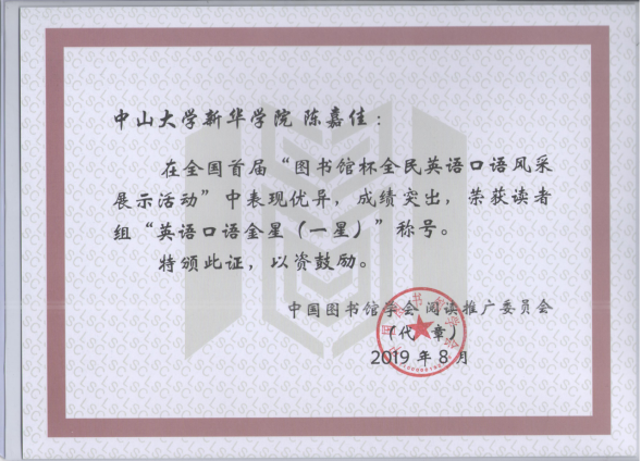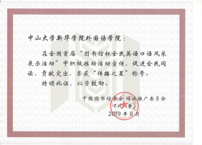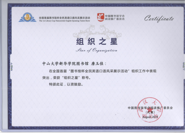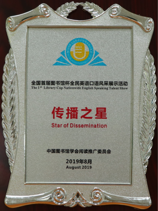 据了解,该活动是历经网络初选历时40天,全国共1317所图书馆参与组织,共有171778名选手报名参加。经过“网络初选”、“网络复选”,晋级“全国总展示”环节的选手有300余名。针对晋级“全国总展示”的作品,评审分为网络初评和现场总评两个阶段。网络初评于2019年8月24日至26日通过活动评审系统由专家组在线完成评分。现场总评于8月30日在广州图书馆举行,我校三位晋级“全国总展示”的读者获本次活动“英语口语金星(1星)”奖,图书馆获“组织之星”奖,外国语学院获“传播之星”奖,图书馆唐玉佳老师获“组织之星”称号。
