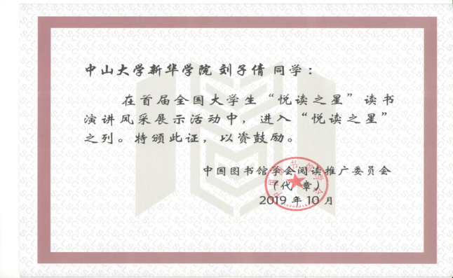 我校图书馆推荐的17级中文系刘子倩读者的作品《生存与逐梦》获全国大学生“悦读之星”荣誉。
