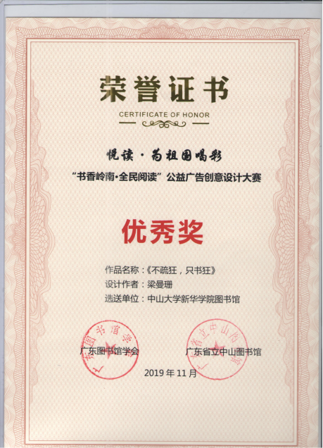 由广东省文化和旅游厅主办、广东省立中山图书馆、广东图书馆学会承办,广东粤图之星科技有限公司协办,广东省各公共图书馆、高校图书馆参与组织,主题为:“书香岭南 全民阅读”。“悦读·为祖国喝彩‘书香岭南·全民阅读’”公益广告创意设计大赛,于2019年5月20开始,面向全国社会读者征集参赛作品。