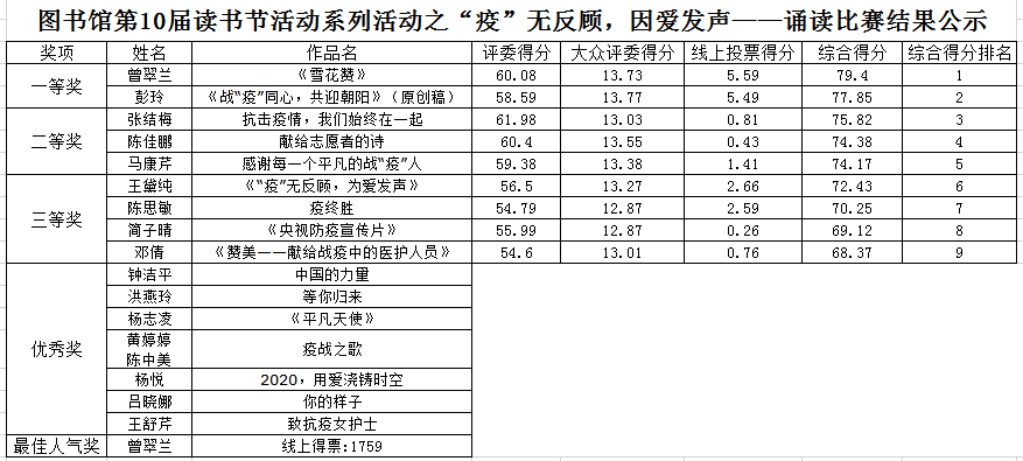 此次读书节的“‘疫’无反顾,因爱发声——诵读比赛”活动征稿于2020年5月6日结束。本次征集到的所有作品经过图书馆组织的7名评委评审,并经过20名大众评委评分和观众线上投票三个环节进行。评选活动于2020年5月25日全部结束,根据活动相关规则及评分细则,现将本次活动最终结果公示如下: