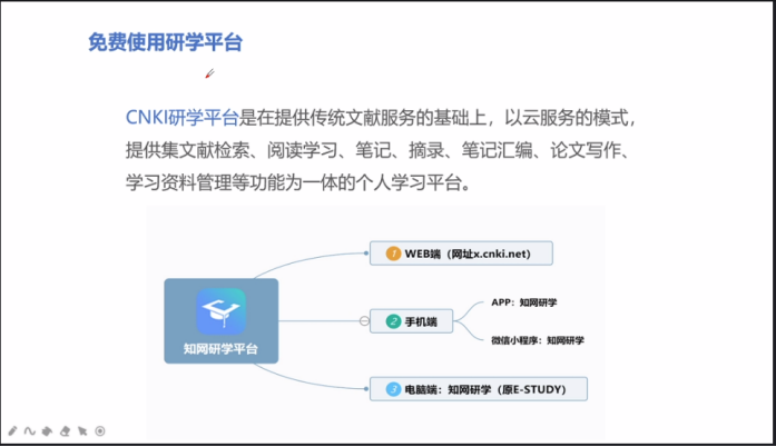 讲座主要介绍了:①、校外如何免费使用中国知网研学平台资源;②、如何利用研学平台根据阅读目的检索文献;③、怎样用好研学平台文献的管理与高效阅读;④、在校外如何利用研学平台撰写论文和投稿;⑤日常使用中国知网常见问题答疑及互动。