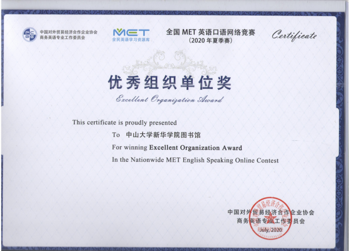 全国met英语口语网络竞赛·2020年夏季赛由中国对外贸易经济合作企业协会商务英语专业工作委员会主办,广东粤图之星科技有限公司承办,于2020年6月22日至7月15日期间在“met全民英语”竞赛平台在线进行。我校图书馆荣获全国met英语口语网络竞赛优秀组织奖。