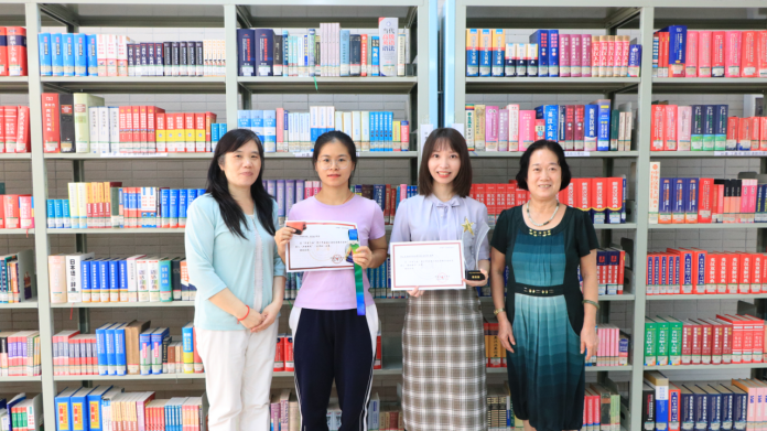 图书馆钟伟珍副馆长(右一)与获奖指导老师外国语学院陈秋丽(右二)、获奖读者19中文李芝晓(左二)同合影