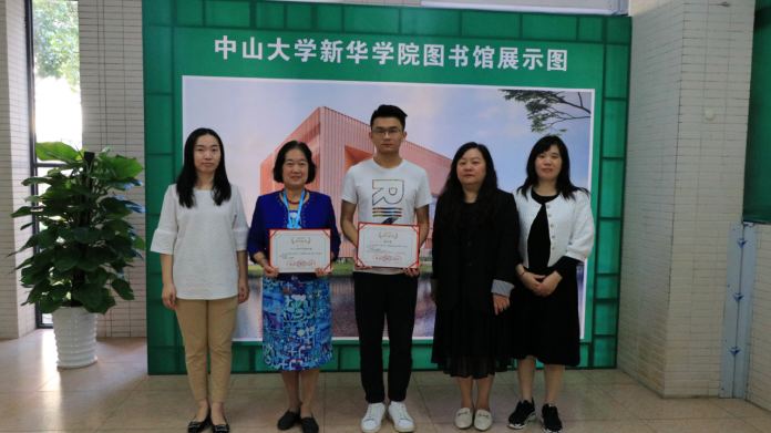 获奖者陈洪栋(中间)与图书馆副馆长钟伟珍(左二)及图书馆老师合影