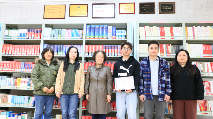 获奖者江寅锐(右三)与图书馆老师及图书馆副馆长钟伟珍(左三)合影