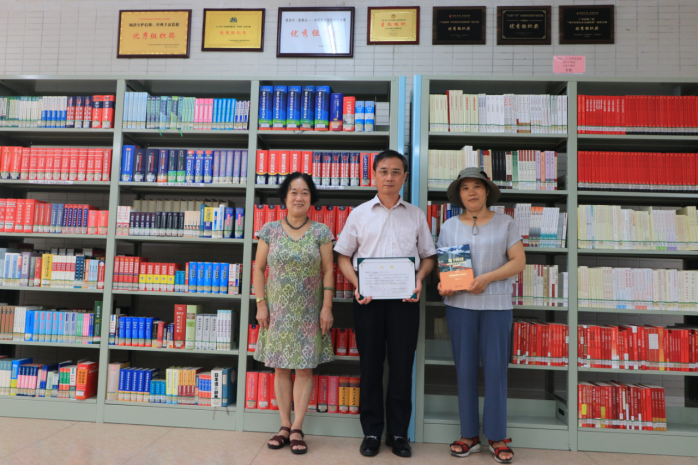 夏南新教授(中)与图书馆副馆长钟伟珍(左一)合影
