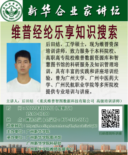 后田结,工学硕士,现为维普资深培训讲师,致力服务于本科院校、高职高专院校维普数据资源库和智慧图书馆的科研服务及知识管理培训,具有丰富的实践和讲座培训经验,曾为广州大学、广州中医药大学、广州民航职业学院等多所院校提供专业培训与讲座。