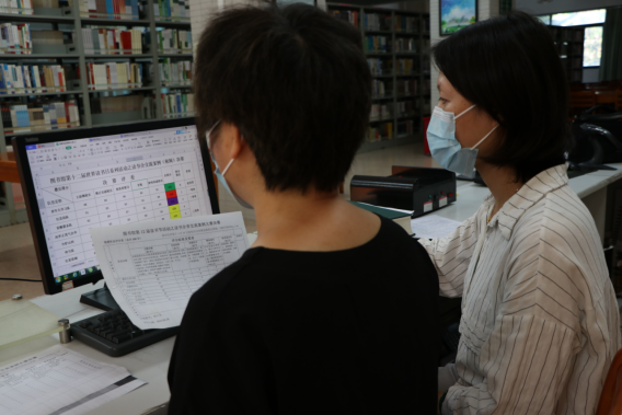 图书馆唐玉佳老师(左)和王碧玉老师(右)在图书馆计算专家评委打分结果
