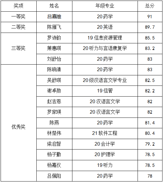 比赛在腾讯视频会议,通过学习通进行线上比赛,参赛者经过1小时50分紧张又激烈答题。根据比赛规则,竞赛最后按得分高低排序角逐出:一等奖:1名;二等奖,1名;三等奖:3名;优秀奖:11名。现获奖名单公布示如下: