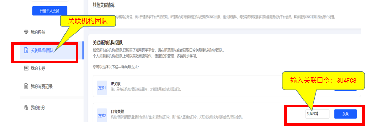 2.在右上角账号找“个人中心”,选择“关联机构团队”,在关联处输入(口令:3u4fc8),关联机构账号,即可正常使用资源。