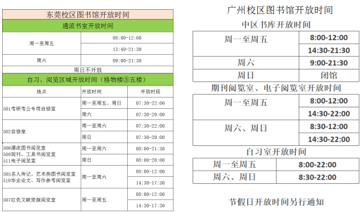 另外,广州校区中区书库因进行下架打包工作暂时闭馆,开馆时间另行通知。