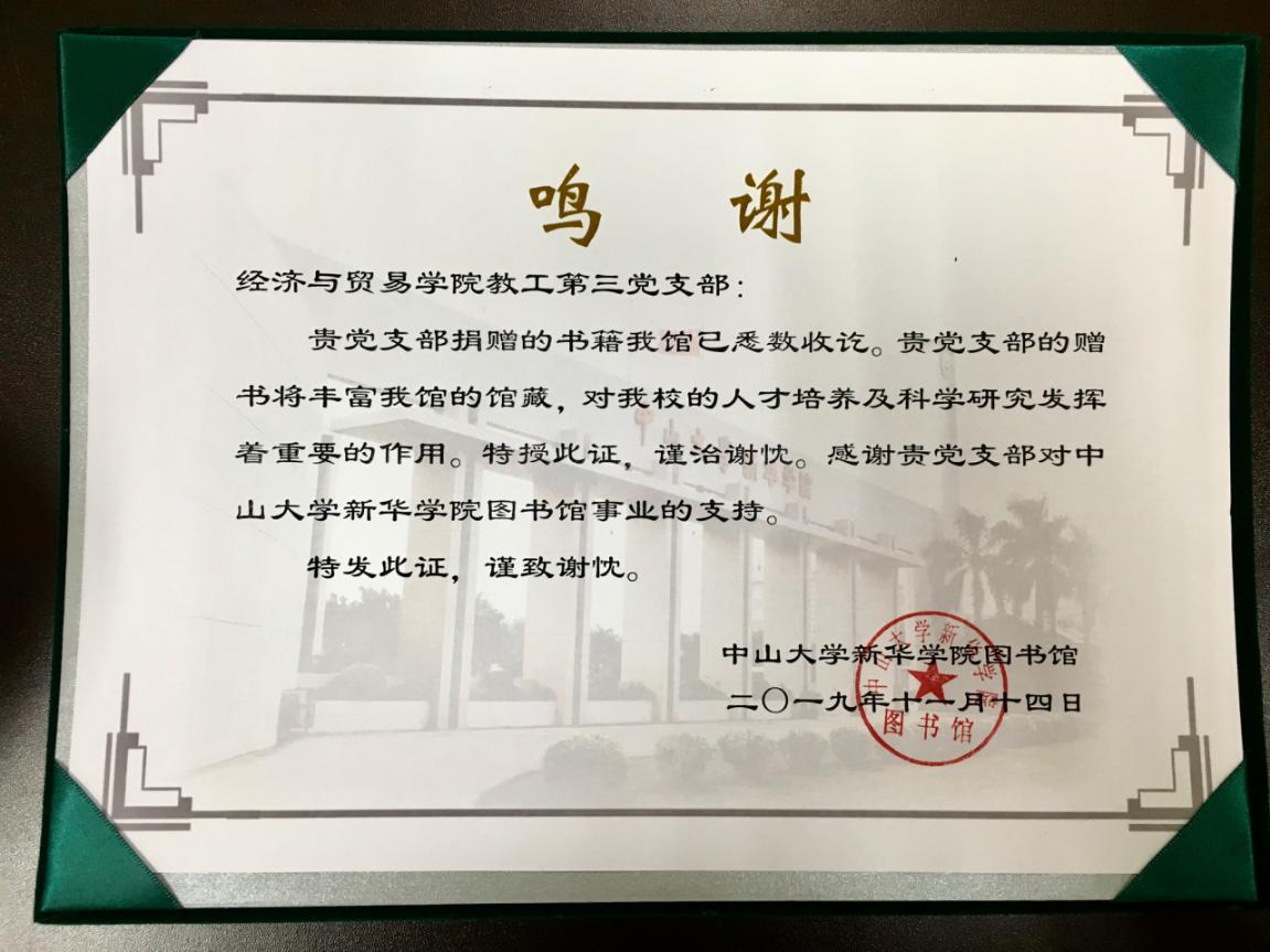 11月14日下午,中山大学新华学院经济与贸易学院教工第三党支部开展了“新华情 党员心 书留香”捐书活动,支部党员在支部书记李丹琳同志的带领下与图书馆谢缓蔚同志和王碧玉同志在格物楼1c区图书馆举行捐书仪式。本次活动旨在为进一步深入开展“不忘初心、牢记使命”主题教育,加强党支部基层建设和凝聚力,激励支部党员同志以实际行动践行初心使命。
