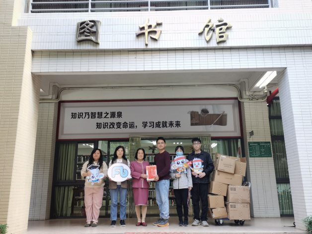 粉笔教育东莞地市负责人廖炳鹏(右三)与图书馆副馆长钟伟珍(左三)合影