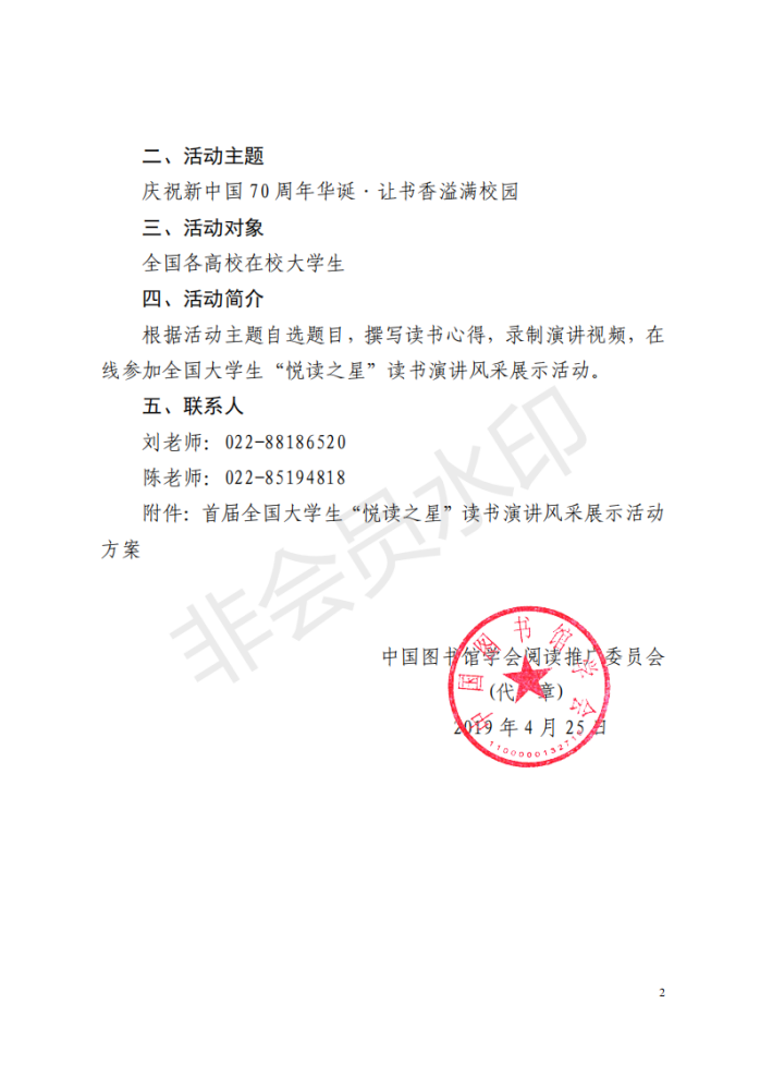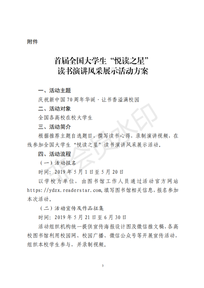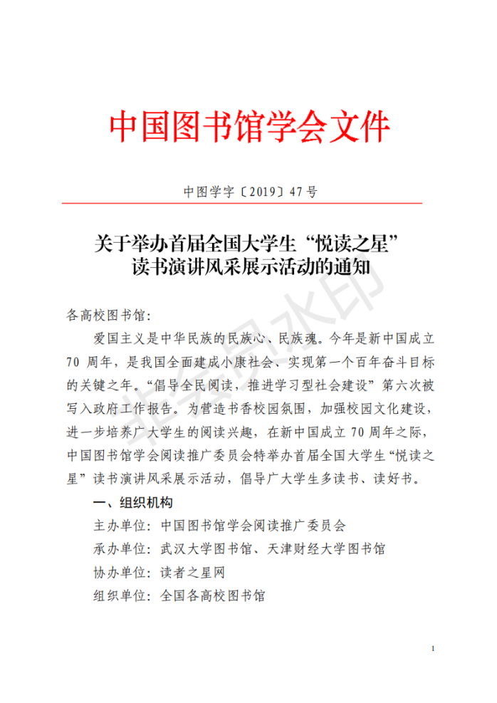 由中国图书馆学会阅读推广委员会主办、武汉大学图书馆、天津财经大学图书馆承办的首届全国大学生“悦读之星”读书演讲风采展示活动初赛面向我校两校区读者学生开展。图书馆与学校新闻宣传中心联合举办本次大赛校内初赛,请广大读者积极参赛。参赛规则详细活动通知原件。