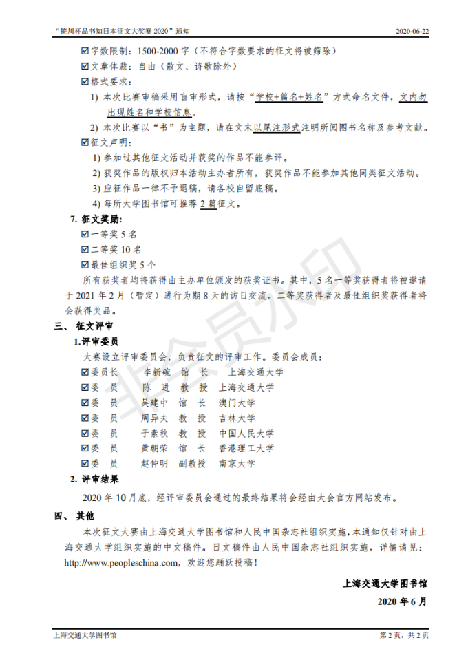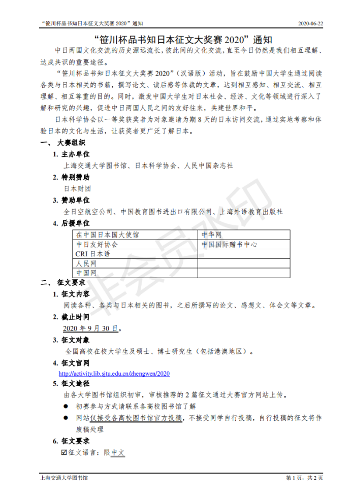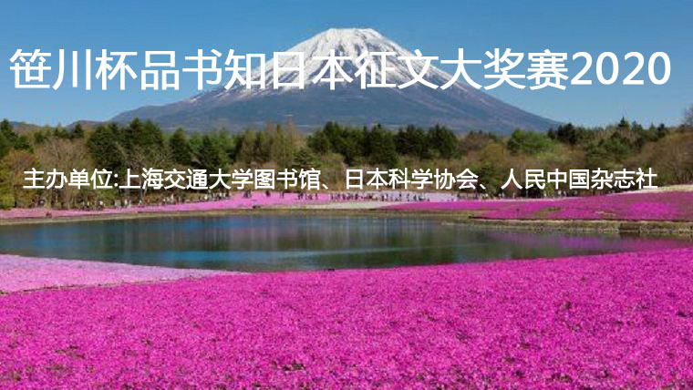 由上海交通大学图书馆、日本科学协会、人民中国杂志社共同主办的“笹川杯品书知日本征文大奖赛2020”已于2020年6月开始。我校图书馆与外国语学院拟联合组织我校在校学生参加该项赛活动,请广大学生读者积级投稿参赛。