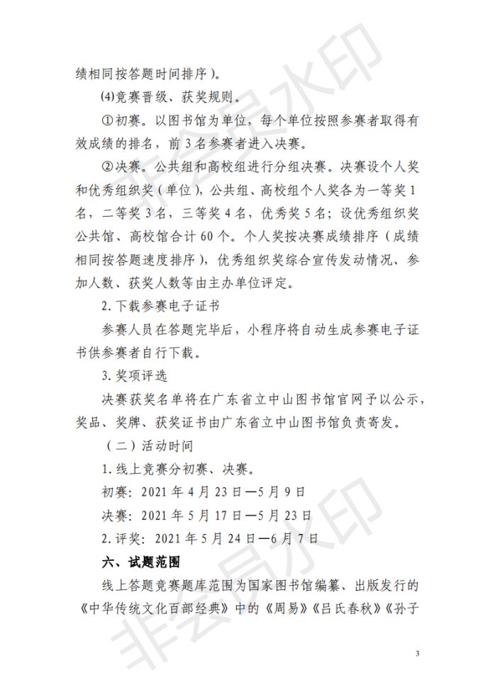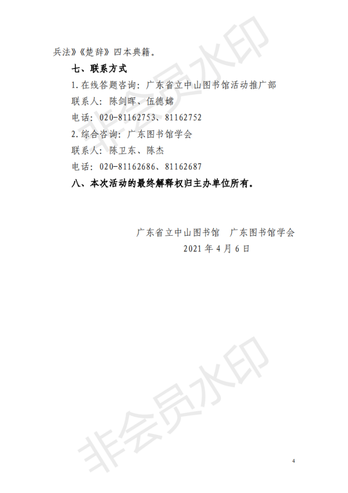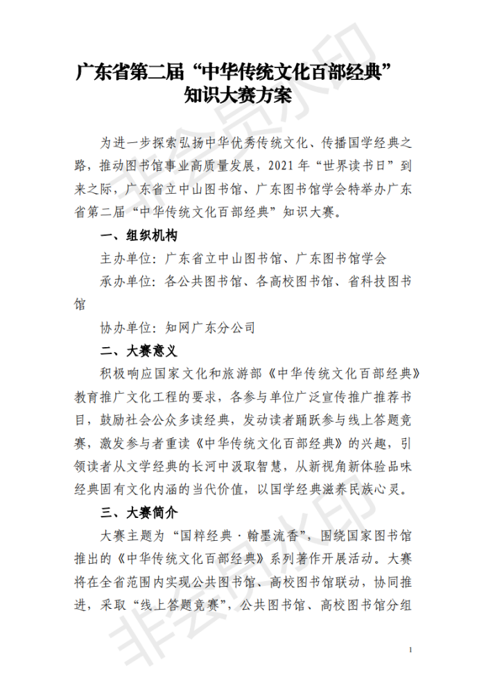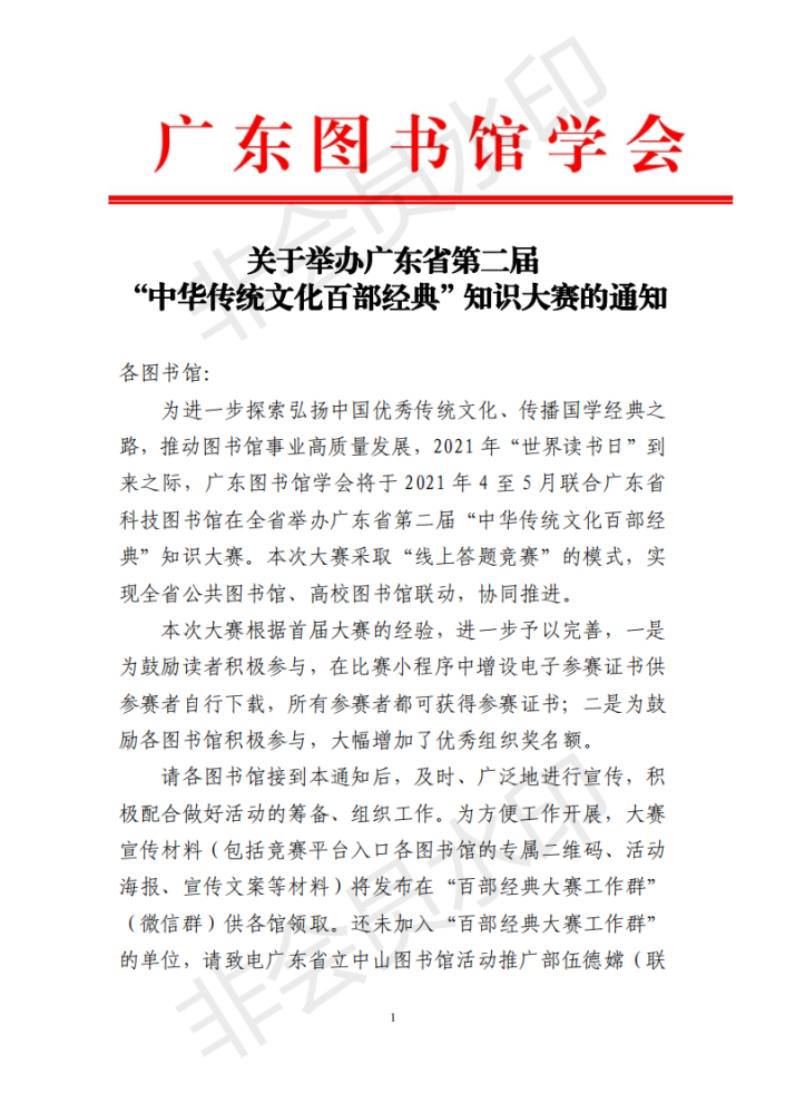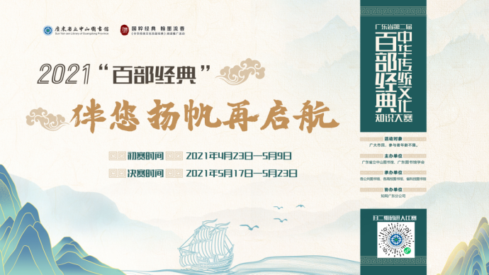 由广东省立中山图书馆、广东图书馆学会主办的“国粹经典·翰墨流香”——广东省第二届“中华传统文化百部经典”知识大赛将于2021年4月23日拉开帷幕。欢迎广大师生读者积极报名参赛。比赛详细规则见活动通知附件及大赛方案。
