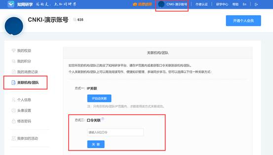 3、登录个人账号后,在研学平台“个人中心”,选择“关联机构团队”,在关联处输入(口令:3j60se),即可正常使用。(详情请点击图片)