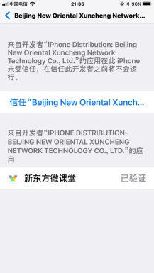 3、ios系统部分版本需要信任流程,完成下载后不能打开app,这时候依次点击手机的设置-通用-设备管理(有的版本是描述文件), 如下图2,点击中间的信任,弹出图3,点击信任即可完成授信流程,回到k8凯发百家乐首页点击新东方微课堂即可打开app。