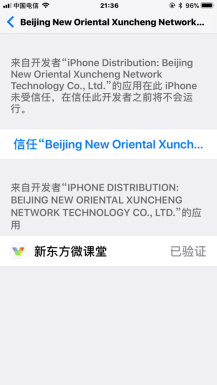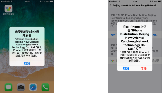 3、ios系统部分版本需要信任流程,完成下载后不能打开app,这时候依次点击手机的设置-通用-设备管理(有的版本是描述文件), 如下图2,点击中间的信任,弹出图3,点击信任即可完成授信流程,回到k8凯发百家乐首页点击新东方微课堂即可打开app。