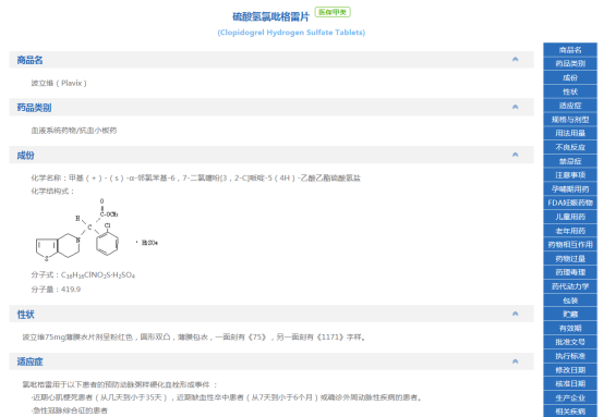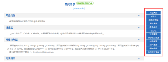 在药品的细览里,根据需要查看药品的药品别名、药品类别、适应症、用法用量、不良反应、禁忌症、注意事项、药物相互作用、药代动力学、相关疾病和临床相关文献等相关内容。(图2-21)