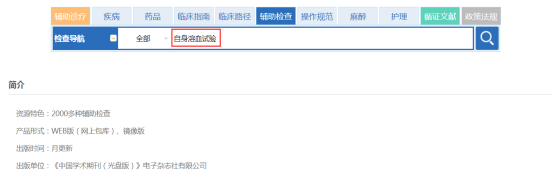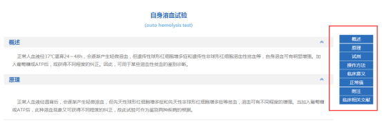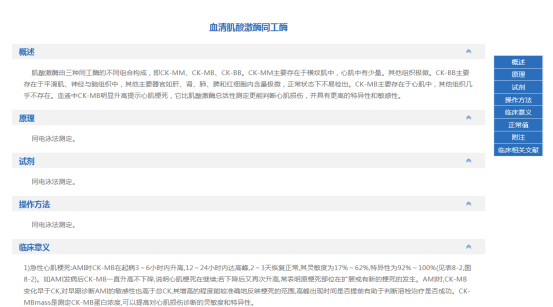 在辅助检查的细览里,根据需要查看辅助检查的概述、原理、试剂、操作方法、临床意义、正常值、附注以及临床相关文献。还可以查看此辅助检查的临床相关文献的下载。(图2-34、35)