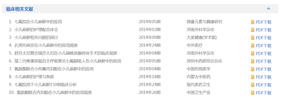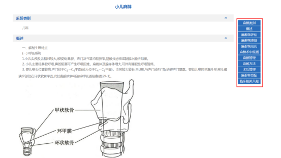 在麻醉的细览里,根据需要查看麻醉的麻醉类别、概述、麻醉前评估、麻醉前准备、麻醉前用药、麻醉选择、术中管理、麻醉术中检测、麻醉管理、麻醉方法、术后管理、恢复期管理、麻醉并发症、注意事项及临床相关文献。还可以进行临床相关文献的下载。(图2-44、45)