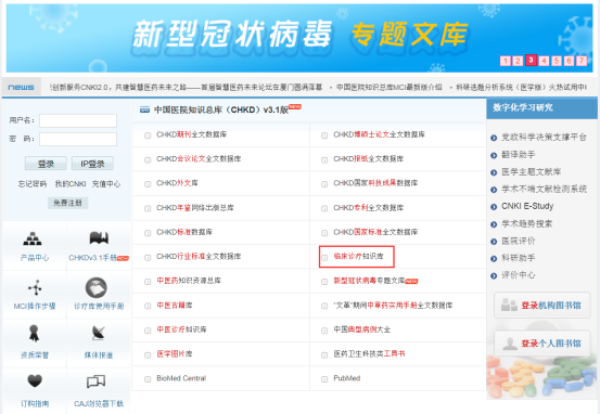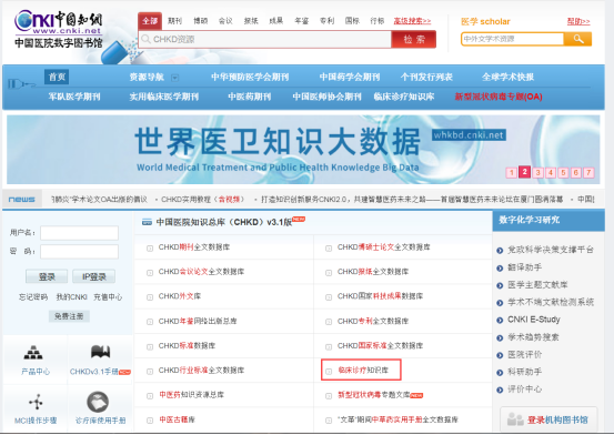 ⑴ 登陆www.chkd.cnki.net,点击“临床诊疗知识库”(图1-1)。