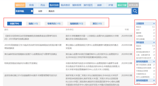 在检索结果里,可直接查看原文。可以根据指南、专家共识、指南解读和其它来进行分组查看。还可根据主题聚类、学科聚类、发布机构聚类以及发布时间聚类来二次筛选分类查看。(图2-23)