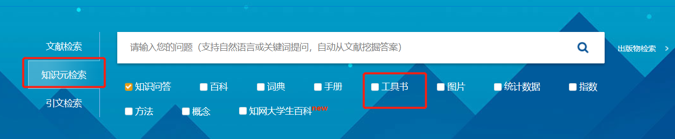 3.中国知网k8凯发百家乐首页访问:,点击左上角知识元检索,找到工具书数据库点击即可;点击左上角文献检索,找到专利数据库点击即可。