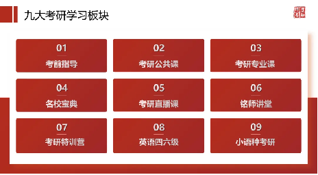 平台课程包含考前指导、考研公共课、考研专业课、名校宝典、考研直播课、铭师讲堂、考研特训营、英语四六级、小语种考研"九大学习板块"。全面覆盖考研学习的各个阶段,全流程助力学生的考研学习