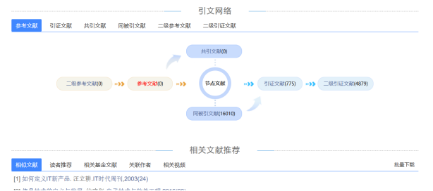 知网节模块“知网节”是以揭示不同文献或知识之间的关联关系为目标,以某篇文献或者某个知识点为中心的知识网络。它通过文献或知识的聚类功能,将不同文献或知识之间的内在关系进行有机整合,将cnki数据库中期刊、学位论文、报纸、会议论文、图书等不同类型的文献进行关联,在此基础上,进一步形成了文献知网节、作者知网节、基金知网节、机构知网节等,从而构建系统的知识网络和内容解释体系。