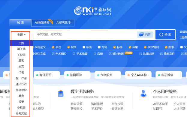 检索字段 主题、篇关摘、篇名、关键词、摘要、小标题、全文、参考文献、中图分类号、doi、栏目信息、基金、作者、第一作者、通讯作者、作者单位、第一单位、期刊名称、年、期、issn、cn、来源类别。