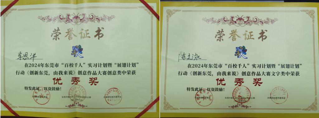据了解,本次大赛自7月18日启动至8月8日圆满结束,吸引了众多高校学子的积极参与。活动以线上投稿的形式进行,分为视频类、文字类及创意类三大类别。此次活动共有9个作品获奖,包含文字类、视频类以及创意类各3个作品。经过激烈的竞争与专业的评审,我校23法学陈文泳同学的文字作品和23级艺术设计李思洋同学的创意作品在“创新东莞,由我来说”创意作品大赛中荣获优秀奖。
