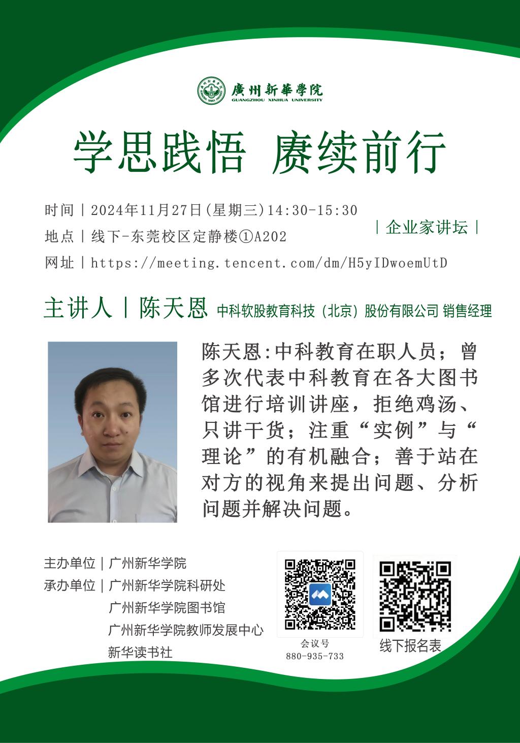 陈天恩,中科教育在职人员;曾多次代表中科教育在各大图书馆进行培训讲座,拒绝鸡汤、只讲干货;注重“实例”与“理论”的有机融合;善于站在对方的视角来提出问题、分析问题并解决问题。