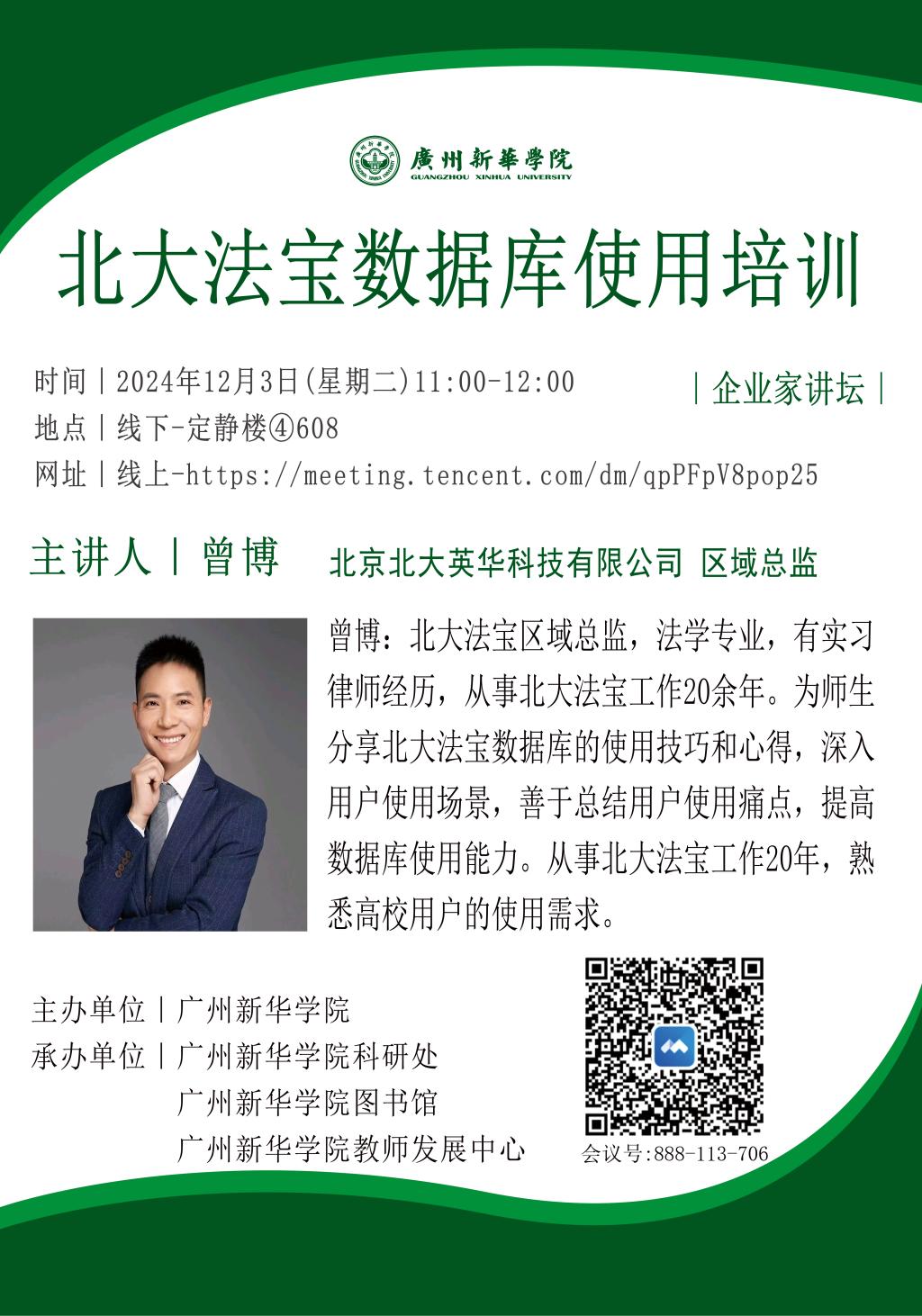 曾博:北大法宝区域总监,法学专业,有实习律师经历,从事北大法宝工作20余年。为师生分享北大法宝数据库的使用技巧和心得,深入用户使用场景,善于总结用户使用痛点,提高数据库使用能力。从事北大法宝工作20年,熟悉高校用户的使用需求。