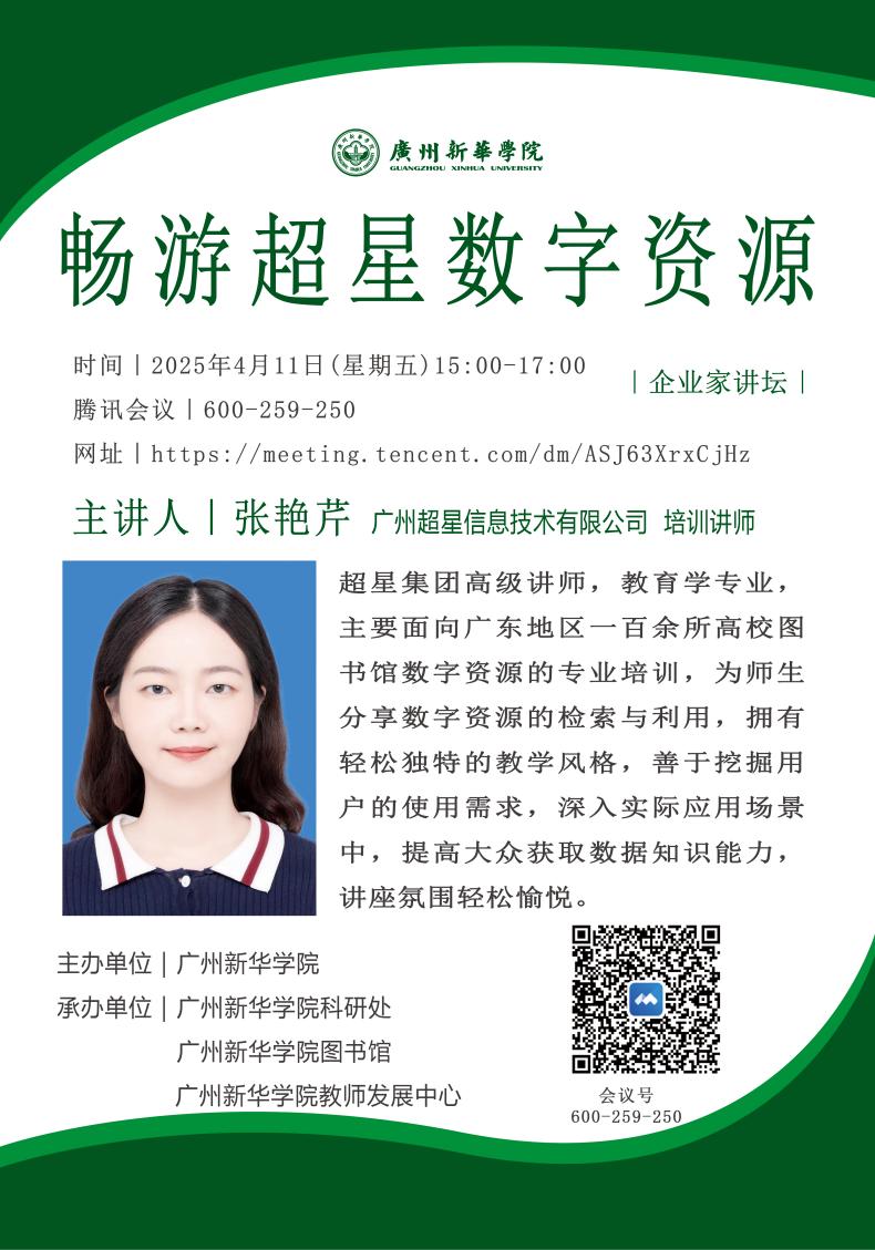 张艳芹:超星集团高级讲师,教育学专业,主要面向广东地区一百余所高校图书馆数字资源的专业培训,为师生分享数字资源的检索与利用,拥有轻松独特的教学风格,善于挖掘用户的使用需求,深入实际应用场景中,提高大众获取数据知识能力,讲座氛围轻松愉悦。