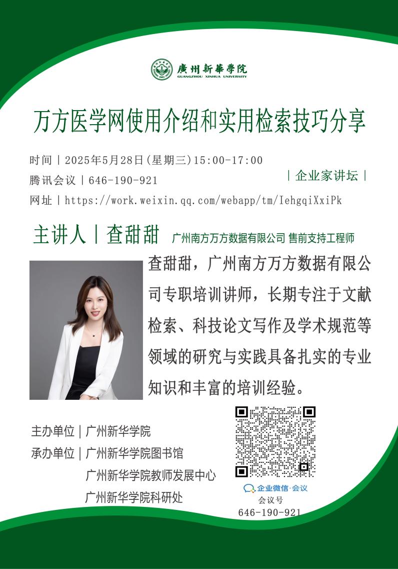 查甜甜,广州南方万方数据有限公司专职培训讲师,长期专注于文献检索、科技论文写作及学术规范等领域的研究与实践具备扎实的专业知识和丰富的培训经验。