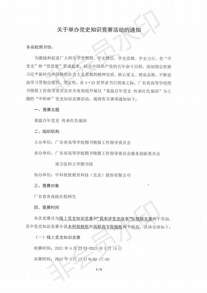 由广东省高等学校图书情报工作指导委员会主办,广东省高等学校图书情报工作指导委员会服务创新委员会、南方医科大学图书馆承办的中科杯“重温百年党史 传承红色基因”党史知识竞赛活动开赛,欢迎我校广大师生积极参赛。活动详细规则见通知附件。