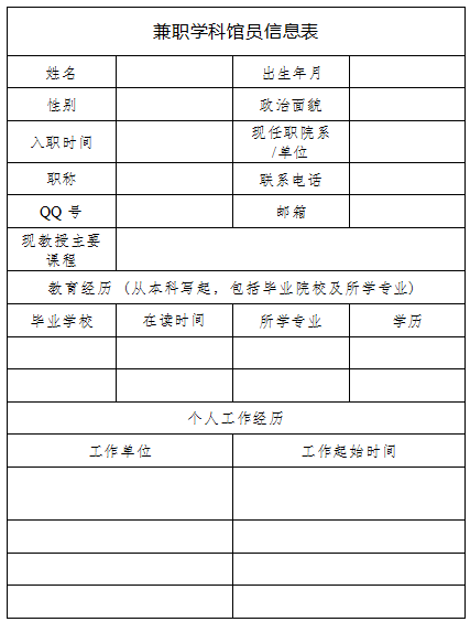 图书馆按工作需要向各教学单位发送兼职学科馆员推荐通知,各教学单位收到通知后推荐至少一名符合要求的专任教师作为兼职学科馆员候选人并提交候选人信息表(见附件2)。图书馆经过收集筛选后,将录用结果公示并反馈给各教学单位和录用教师。